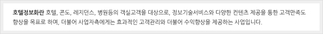 위에 언급된 요소들이 적절히 통합되고 통제될떄 최적의 서비스제공이 가능하며, 호텔정보화란 사업자측과 해당고객 그리고 호텔정보화업체가 만들어내는 최고의 시너지라고 말할 수 있습니다.