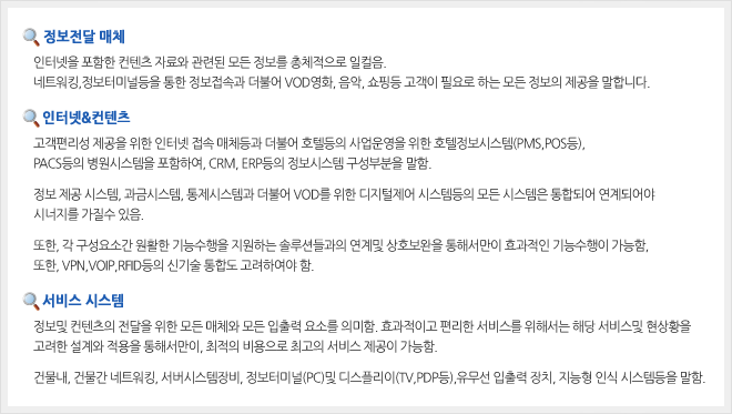 편리한 정보제공 및 완벽한 고객서비스 제공을 위한 IT 기술의 접목 및 인터페이스를 통해서만이 고객 및 사업자측은 최고의 편리성을 느낄 수 있습니다. 다중언어, 데이터복구, 보안, 원격관리, VIP, VOD등 |