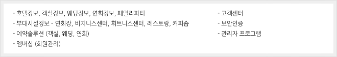 호텔 및 리조트 부문의 IT 솔루션 전문회사로써 고객과의 효과적인 커뮤니케이션을 위한 최적의 웹사이트를 제공하여 드립니다. 호텔 및 리조트 사업부문의 다양한 경험과 프로젝트 노하우로 고객사가 놓치는 세심한 부분까지 고려하여 홈페이지를 구축하고, 관리 운영하여 드립니다.